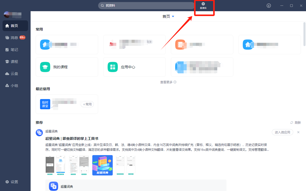 (2)电脑端:可下载学习通电脑PC客户端(下载地址:http://apps.chaoxing.com/),登录后在顶部“邀请码”按钮位置输入:kt763322即可进入会议。